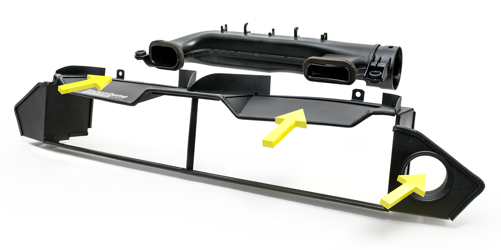 The ACAI auxiliary scoop can be easily connected to an existing Shanon hose (found in all current mountune induction kits and our forthcoming open cone filter kit) with the supplied hose and aluminium joiner as shown, or to feed a third-party induction kit, or to directly channel cold air onto our forthcoming inner-wing-mounted oil cooler kit.