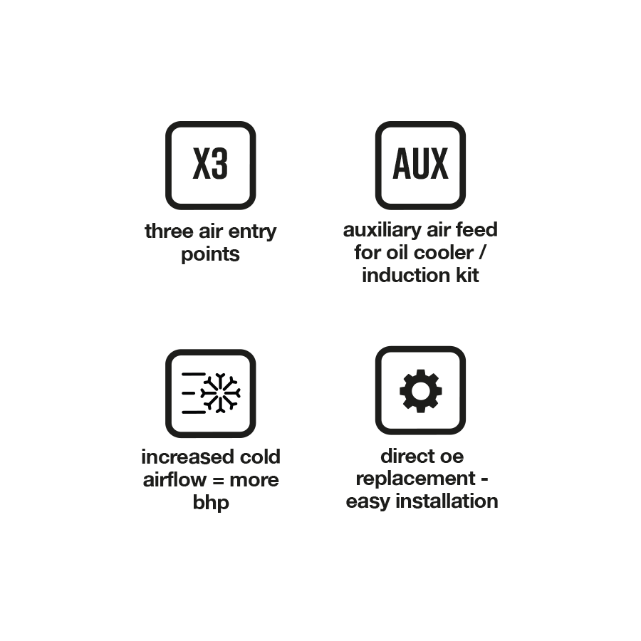 This ensures you get more cold air going into your OE intake crossover pipe, whilst blocking a minimal surface area of the radiator and causing a negligible affect on the radiators performance, unlike some larger standalone scoops.
